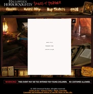 On the map of Terra Cruentus found on the Halloween Horror Nights: Tales of Terror website, visitors could click on and view the The Hollows region of the map. In the North Hollow, they could access the website page for Cold Blind Terror by clicking on an cave with a person inside. On the page, guests could see a tent with a typewriter, various climbing gear, a notebook, and some tapes. Clicking on the typewriter shows a strange clue for the Terra Clue Game, which translates to possibly the words “very cold/ cannot see/ afraid/ help . Visitors could also click on a map to see the map of the area. Additionally, guests could click on the notebook to read the journal left by the explorers. Clicking on the lamp on the table made the lights go out and a woman could be heard screaming. Finally, guests could click on three audio tapes to hear the fates of the explorers.