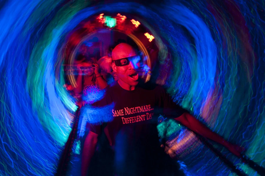 Revolving Tunnels have been a staple of numerous Halloween Horror Nights houses in the past and present. It is a large spinning tunnel that guests walk through that features claustrophobic colors and strobe lights designed to make guests feel dizzy when walking through.