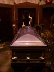 The house would mark the first official appearance of Cindy Caine, The Caretakers daughter and scrapped icon for Halloween Horror Nights: Islands of Fear. She appeared as a corpse in a coffin near the beginning of the house.