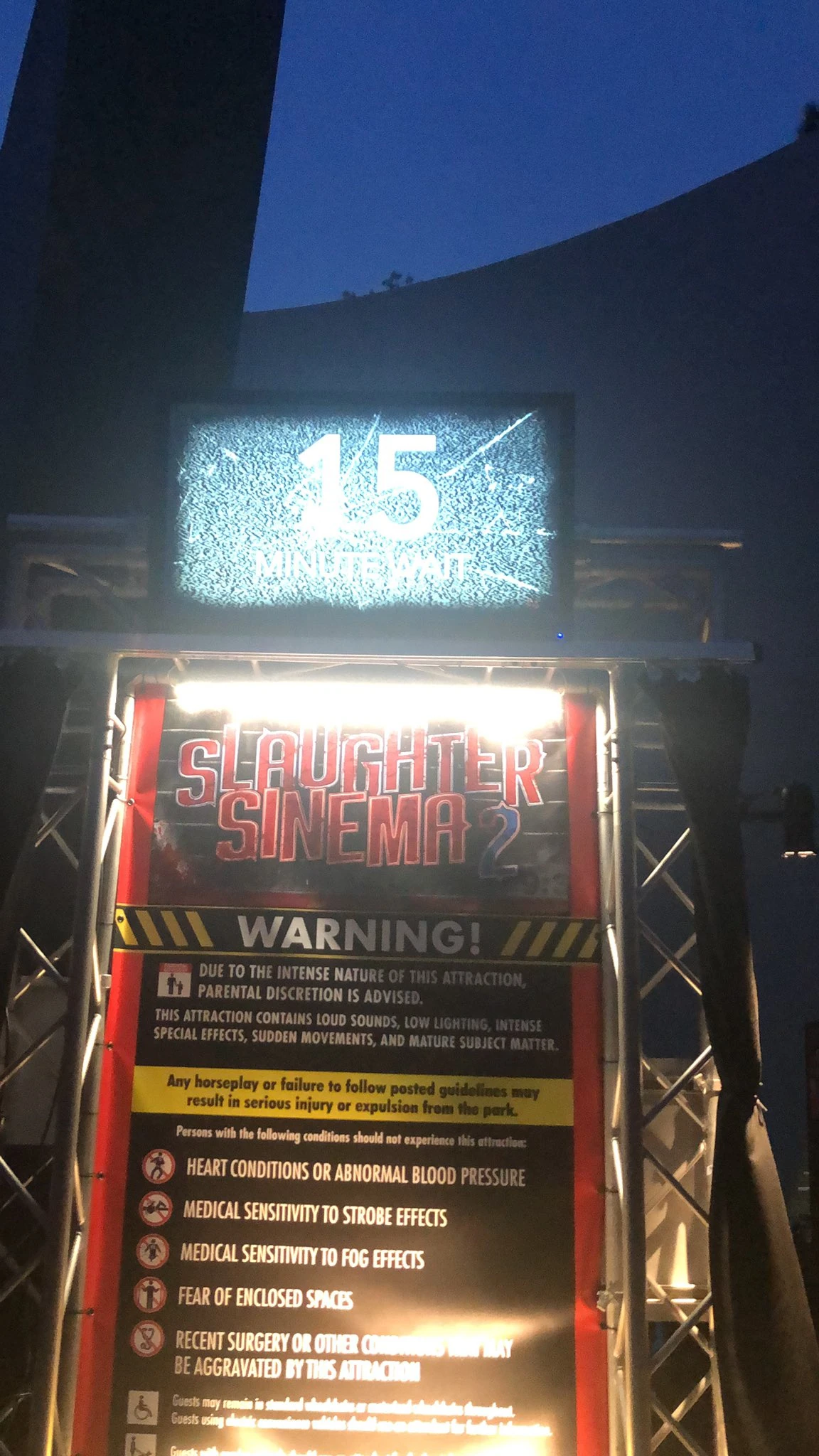 Slaughter Sinema 2 was one of the ten haunted houses featured during Halloween Horror Nights 33. it was a sequel to the 2018's Slaughter Sinema haunted house during Halloween Horror Nights 28. It is located in Sprung Tent 2.